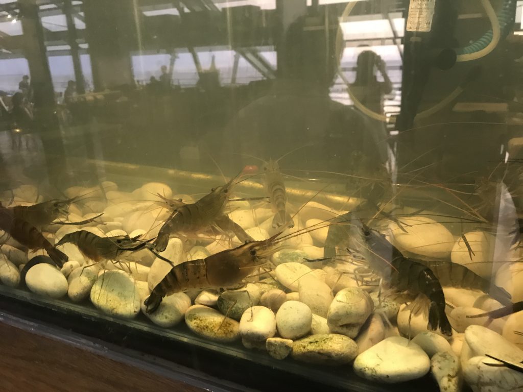 So konnten wir beide alles probieren und schmecken. Uns hat es sehr gut geschmeckt. Leider wurden wir erst nach der Bestellung darauf hingewiesen, dass es auch die Option gibt sich etwas frisches aus den Aquarien auszusuchen. Da Christoph so etwas noch nie probiert hatte, musste das natürlich on top zu den bereits bestellten Gerichten noch probiert werden.