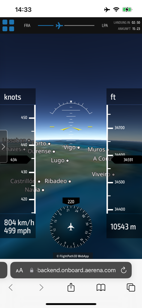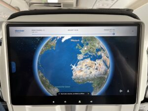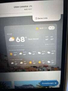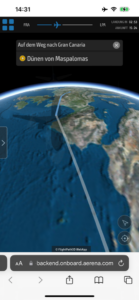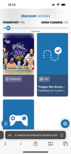 Standardmäßig (außer bei Filmen) ist im oberen Bereich der Anzeige ein Balken eingeblendet, der Abflugsort, Ankunftszeit und Zielort darstellt und grafisch die abgeflogene Strecke/Zeit anzeigt. Eigentlich ein nettes Feature, allerdings wird die Abflugszeit in CEST (Central European Summer Time) angezeigt, was bei uns 2 Stunden früher als die tatsächliche Zeit war, ich bezweifle sehr, dass der „normale Kunde“ dies umrechnen kann/will. Unsere Ankunftszeit wurde in WEST (West European Summer Time) angezeigt, was dann auf den Kanaren der tatsächlichen Zeit entsprach. Auf dem Rückflug war die Abflugszeit 1630 Uhr, im System als 1030 WEST dargestellt, die Ankunftszeit lt. System 2212 CEST – gelandet sind wir um 2212 Uhr Ortszeit – das muss man nicht verstehen. Ebenso ist der kleine Flieger und die verbleibende Flugzeit immer wieder wild hin und her gesprungen, so dass dies keine verlässliche Anzeige darstellt.