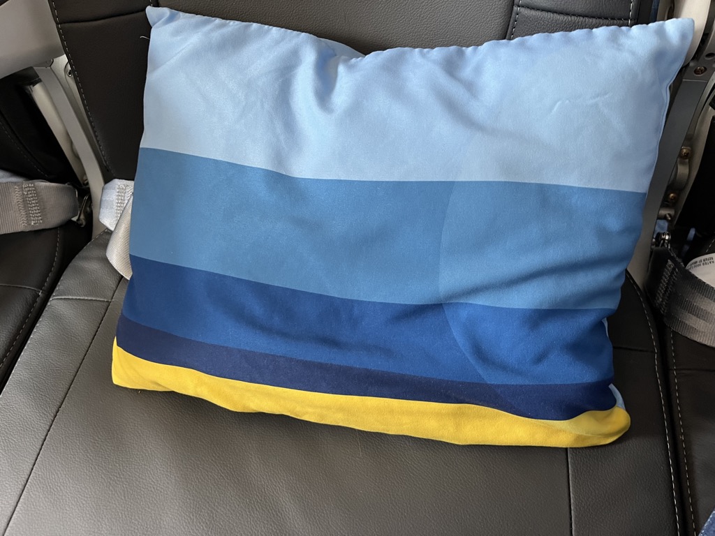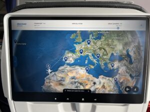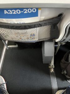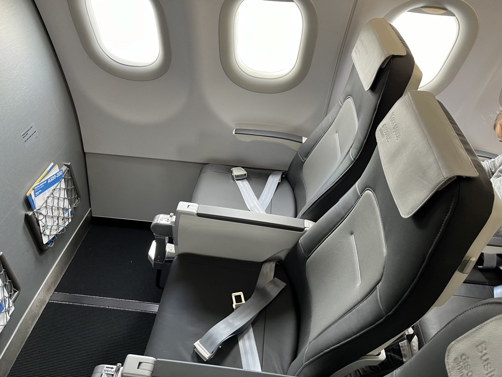 Hier handelt es sich um die klassische All-Eco 3-3 Bestuhlung in 30 Reihen mit 180 Sitzen. Alle Sitze haben einen Monitor mit 3,5mm Klinkenstecker, USB-C Ladebuchse, Kleiderhaken, einen ausziehbaren Tisch mit zwei Vertiefungen für Becher, eine hochklappbare Mittelarmlehne und eine Sitztasche/Netz mit Sicherheitskarte, Boardmenü und Tüte. Die Reihe 1 hat feste Armlehnen, da hier Tisch und Monitor verbaut sind, der Monitor ist in Reihe 1 deutlich kleiner. Die Sitze lassen sich leicht nach hinten neigen, der Monitor ist aber starr, ohne dass dies das Bild beeinträchtigen würde. In der Business Class wird der Mittelsitz geblockt, somit hat man mehr Freiraum und Ablagefläche. In den ersten 12 Reihen ist der Sitzabstand etwas größer als ab Reihe 14 – die erste Reihe nach dem Notausgang. Reihe 1, 11 und 12 haben den größten Sitzabstand. Da die Sitze erst ein paar Tage im Einsatz waren, war alles super neu, sauber, frei von Schäden und gut gepolstert, mir persönlich sind die Sitzlehnen der Geven Sitze allerdings etwas zu kurz, um den Kopf richtig anlehnen zu können. In den Gepäckfächern über der ersten Reihe standen Kissen und Decken für die Business Class nach dem first come – first serve Prinzip zur Verfügung. Zu beachten ist, dass das Entertainment System je 3er-Reihe bis zu 2 Boxen im Fußraum mit sich bringt, die hier zu leichten Einschränkungen des Platzes führen.
