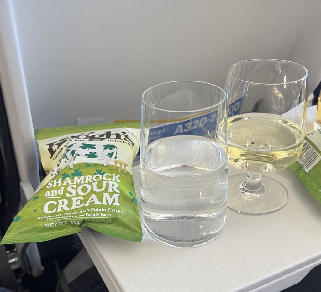 Exakt 30 Minuten nach dem Start stand der Winzersekt, ein Glas Wasser und eine Tüte Chips auf dem Tisch, leider ohne jegliche Serviette. Die Getränkewünsche wurden davor natürlich abgefragt. Neben den üblichen Kaltgetränken standen auch Weis-/Rotwein, Bier, Whiskey, Gin und Zitronenscheiben bereit, somit waren auch ein paar Mixgetränke möglich. Der Service erfolgte immer direkt aus der Galley, also ohne Wagen, was bei 3 Reihen Business und zwei Flugbegleitern natürlich ein Einfaches ist. Eine Flugbegleiterin duzte die Gäste konsequent, die Kabinenchefin nutze das Sie, interessant ist auch, dass die Crew auf Ihren Namensschildern nur den Vornamen hat, daher habe ich dann auch das Du verwendet.