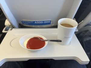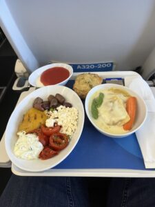 Bereits 40 Minuten nach dem Start wurde das Essen gereicht, es kam alles auf einem Tablett direkt aus der Galley. Es beinhaltete eine größere kalte Vorspeise, ein Nudelsalat mit Erbsen, etwas Antipasti obendrauf, Schafskäse und einen Quark Dip mit warmen Brot und Butter. Geschmacklich war das in Ordnung, aber irgendwie war es ein kleines Durcheinander. Die warme Komponente bestand aus vegetarisch gefüllten Nudeln in einer Sauce mit Erbsen und einer steinharten Karotte. Geschmacklich sprach das Gericht mich an, generell würde ich aber gerne wissen, was ich esse. Leider gab es keinerlei Information, bzgl. des Essens, die Crew hatte hier nur minimale Informationen auf das iPad geladen bekommen. Ebenso hatte die Crew keinerlei Informationen zu den Inhaltsstoffen / Allergenen der Speisen. Als Nachspeise war eine Creme mit einer Erdbeersauce geladen, die lecker schmeckte, hierzu wurde Kaffee oder Tee angeboten. Eine Auswahl beim Essen gab es nicht.