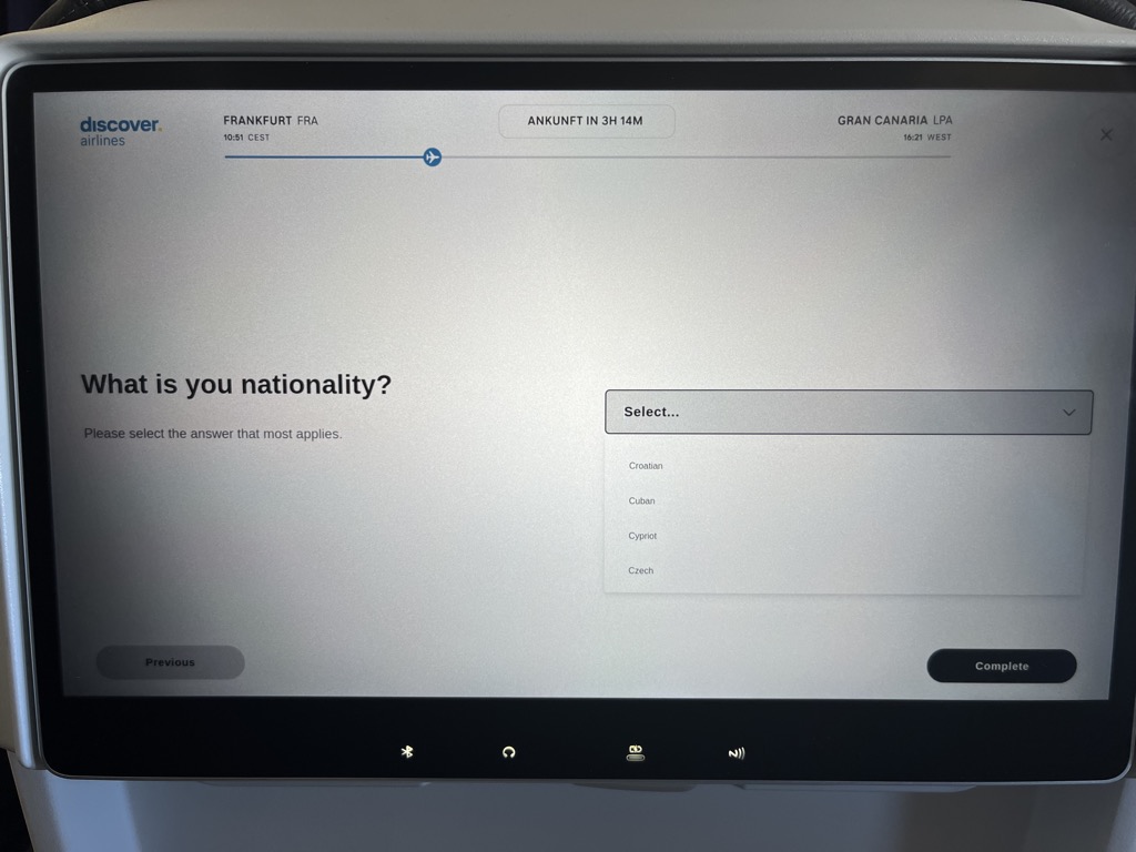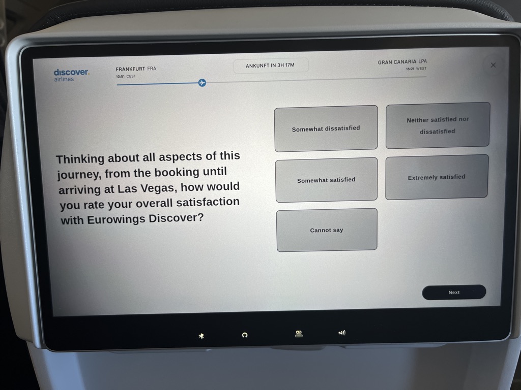 In der Umfrage wurden wir nach der Zufriedenheit mit Eurowings Discover von der Buchung bis zu unser Ankunft in Las Vegas gefragt – spaßig, drei Fehler in einem Satz: a) die Airline heißt Discover Airlines, b) wir fliegen nach Las Palmas und c) wie soll ich im Flug die Zufriedenheit meiner noch nicht erfolgten Ankunft bewerten. Bei der Auswahl der Nationalität beschränkten sich die Möglichkeiten auf Croatian, Cuban, Cypriot and Czech. Ebenso gab es die Umfrage nur in Englisch.