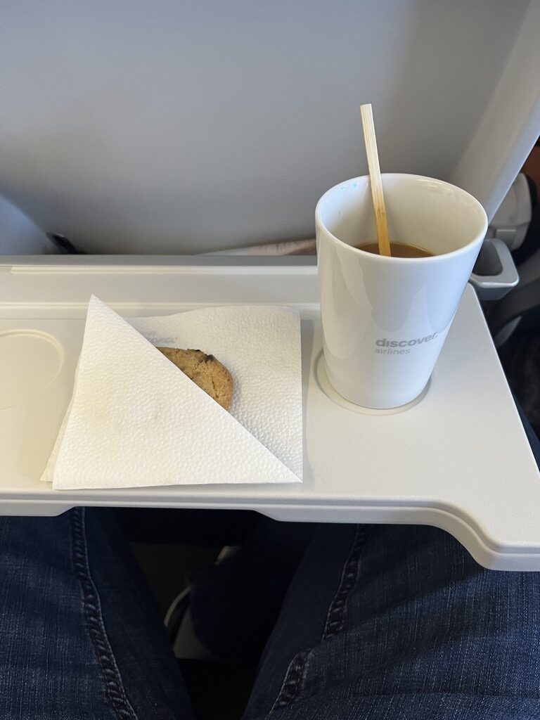 In der Summe gab es 6-mal einen Getränkeservice auf einem Flug von 4,5 Stunden, das ist schon top! Servietten gab es grundsätzlich nie zu den Getränken/Snack, was zu optimieren wäre. Feuchte Tücher gab es generell keine, auch nicht in den Toiletten. In der vorderen Toilette gab es aber neben Seife, Kosmetik- und Handtüchern noch Desinfektionsmittel und eine Handcrème. Alle Getränke wurden immer in Gläsern gebracht, resp. das Glas wurde wieder aufgefüllt, wenn man mehr wollte. Kaffee/Tee kam im Porzellanbecher, alles Gefäße sind Discover gebrandet.
