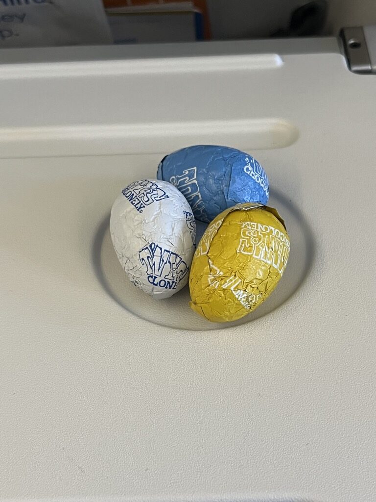 2,5 Stunden nach Abflug wurde der warme Discover Cookie zusammen mit einer weiteren Runde Getränken gereicht, hier hatte die Crew sich richtig Mühe gegeben und jeden Keks einzeln in eine Serviette eingefaltet. Im gleichen Zuge wurden noch kleine Ostereier (Nusskrokant) für alle verteilt, eine nette Geste passend zu Ostern. Der letzte Getränkeservice wurde ca. 40 Minuten vor der Landung angeboten und ca. 15 Minuten vor der Landung wurde dann alles abgeräumt.