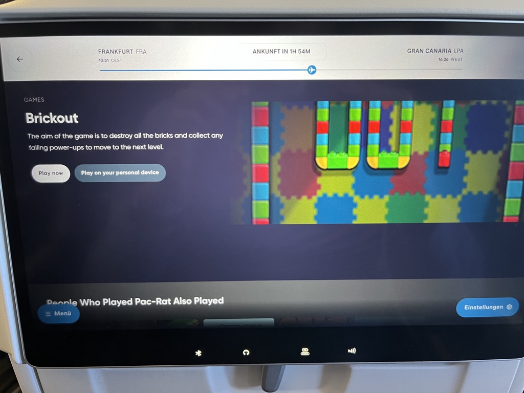Aktuell ist das System nicht an das Internet angeschlossen, ist aber grundsätzlich möglich und soll ggf. ab 2025 kommen. Eine Möglichkeit Spiele mit anderen Personen, also z.B. Sitz 4A gegen Sitz 4D zu spielen, gibt es nicht. Ebenso ist das System, gerade beim Scrollen, sehr ruckelig und die Ladezeiten sind unerwartet lang. Was uns verwundert hat, ist dass das System nicht für die Sicherheitsunterweisung verwendet wurde, offensichtlich gibt es noch keinen passenden Film für den A320.