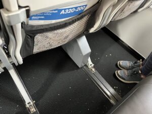 Wichtig zu Wissen ist auch, dass für das Entertainment System viel Technik verbaut werden muss, diese sitzt größtenteils im Fußraum. Generell gibt es in jeder 3er Reihe eine ca. 7cm breite Box, die an der Außenseite der Fußstütze des Mittelsitzes angebracht ist, diese Box geht quasi vom Boden bis an die untere Seite des Sitzes von vorne bis hinten. In Reihe 2 gibt es sogar zwei Boxen, da man hier die Box der Sitzreihen 1 und 2 im Fußraum verbaut hat. Neben dem eingeschränkten Platz im Fußraum produziert die Box eine ordentliche Abwärme.