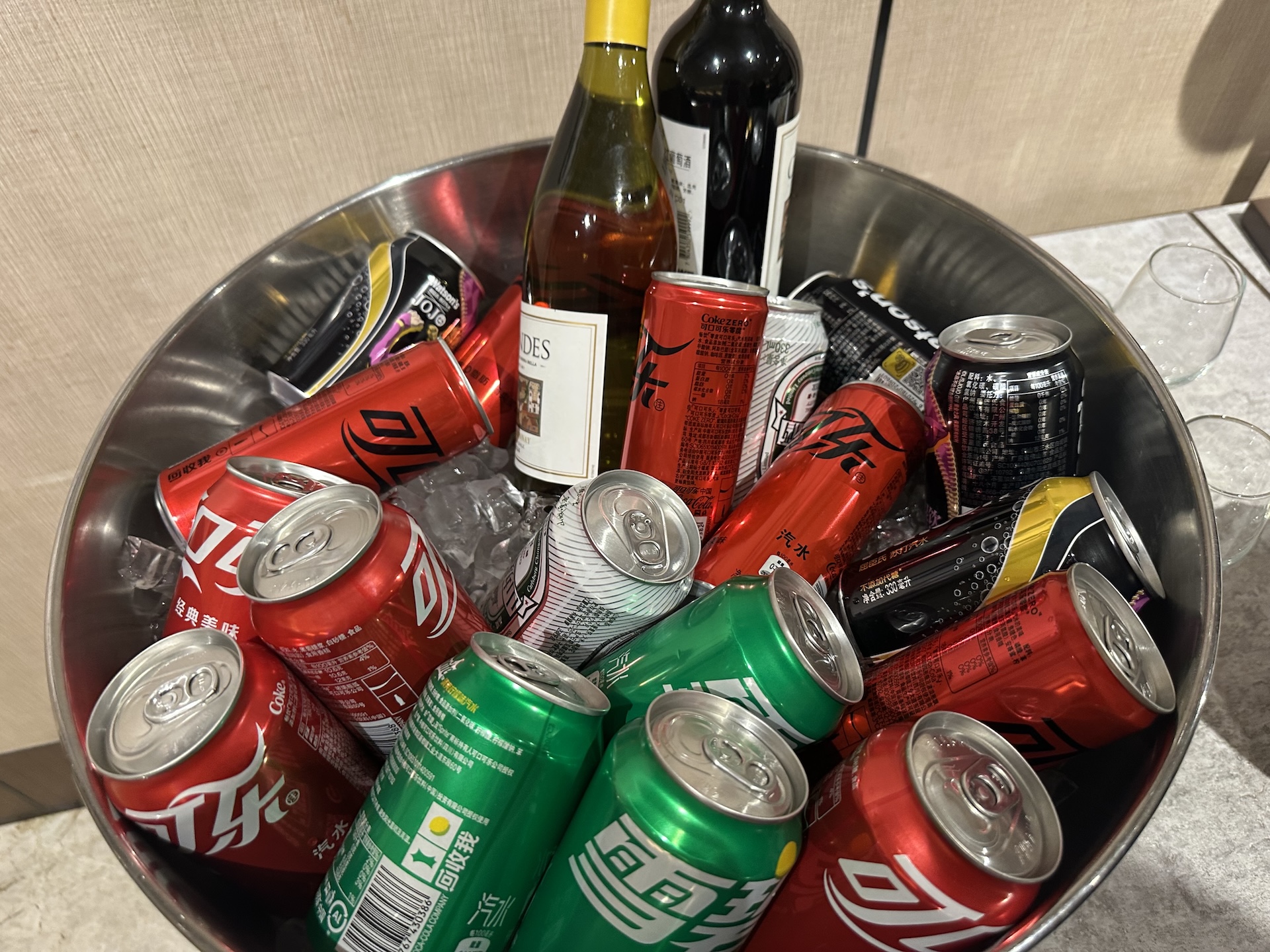 Auf einem Tisch stehen Getränke wie Softdrinks, Bier und Wein. Spirituosen und Longdrinks werden nicht angeboten, dafür darf man aber das volle Buffet des benachbarten Restaurants nutzen. Hier gab es Vorspeisen, Salate, diverse warme Hauptgänge und Desserts.