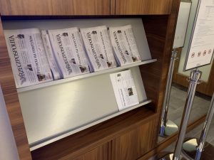 Zur Ausstattung dieses Teils der Lounge gehört ein Fernseher, ein Regal mit Zeitschriften und ein PC-Arbeitsplatz, wobei ich bei unserem Besuch unsicher war, ob dieser frei zugänglich ist oder für Mitarbeiter gedacht ist. Das Büffet wird ebenfalls in diesem Teil der Lounge aufgebaut.