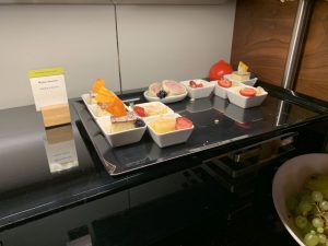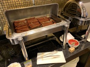 Die Auswahl an Speisen war dafür deutlich besser. So gab es kalte Snacks, wie Schinken mit Honigmelone, Wurst, Pastete und Wraps. Dazu wurden diverse leckere Salate serviert. Sogar drei Warme Gerichte, wie zum Beispiel Schaschlik und Penne, wurden aufgefahren. Diese Gerichte waren sogar wirklich gut im Vergleich zu anderen Lounge-Erlebnissen.