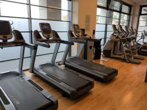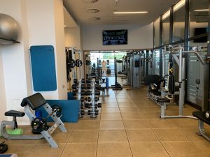 In der untersten Etage findet sich ein großer Fitness-Raum, der alles zu bieten hat, was man so benötigt. Die Cardio-Geräte der Firma Precor sind gleich mehrfach vorhanden, so dass man hier in der Regel mindestens ein freies Laufband oder einen Stepper vorfindet. Dazu gibt es alle möglichen Geräte für Krafttraining plus Hanteln, Gymnastik-Bälle und so weiter. Alles machte eine top gepflegten Eindruck.