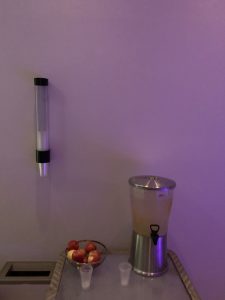 Die „Level-up Zone“ besteht aus zwei Räumen. In dem größeren Teil des Wellness-Bereichs findet sich ein Whirlpool, der in unterschiedlichen Farben beleuchtet wird. Außerdem fanden wir dort eine Sauna, das Dampfbad und einige Duschen inklusive Eis-Schale. Für Erfrischungen ist ebenfalls gesorgt, da direkt neben der Zugangstür ein Wasserspender sowie Obst bereit stehen.