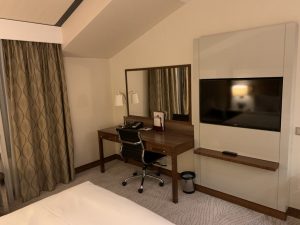 Direkt gegenüber vom Bett hing ein großer Flachbildfernseher an der Wand. Wer nicht vom Bett aus fernsehen will, kann dies auch von einem einzelnen Sessel tun, neben dem auch ein kleiner Tisch stand. Zur Begrüßung warteten auf diesem Tisch auch zwei Flaschen kostenloses Wasser. Links neben dem Fernseher verfügt das Executive Zimmer noch über einen Schreibtisch mit Drehstuhl, der wegen des großen Spiegels auch als Schminktisch genutzt werden kann.