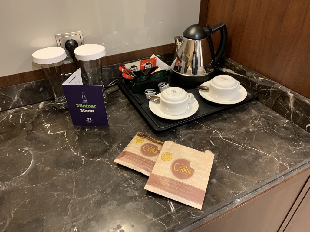 Beim Betreten des Zimmers standen wir zunächst in einem Flur mit einem Schrank an der rechten Wand. Im Schrank fanden wir auch den Safe, unsere Bademäntel sowie Bügelbrett und Bügeleisen. Hinter dem Kleiderschrank stand ein Sideboard mit integrierter Minibar, welche mit ein paar Snacks, Softdrinks, Bier und Spirituosen gefüllt war. Auf dem Sideboard stand ein Wasserkocher mit Instant-Kaffee-Päckchen bereit.