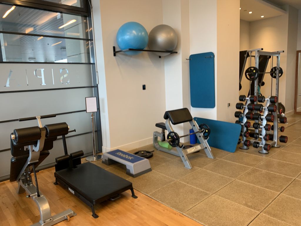 In der untersten Etage findet sich ein großer Fitness-Raum, der alles zu bieten hat, was man so benötigt. Die Cardio-Geräte der Firma Precor sind gleich mehrfach vorhanden, so dass man hier in der Regel mindestens ein freies Laufband oder einen Stepper vorfindet. Dazu gibt es alle möglichen Geräte für Krafttraining plus Hanteln, Gymnastik-Bälle und so weiter. Alles machte eine top gepflegten Eindruck.