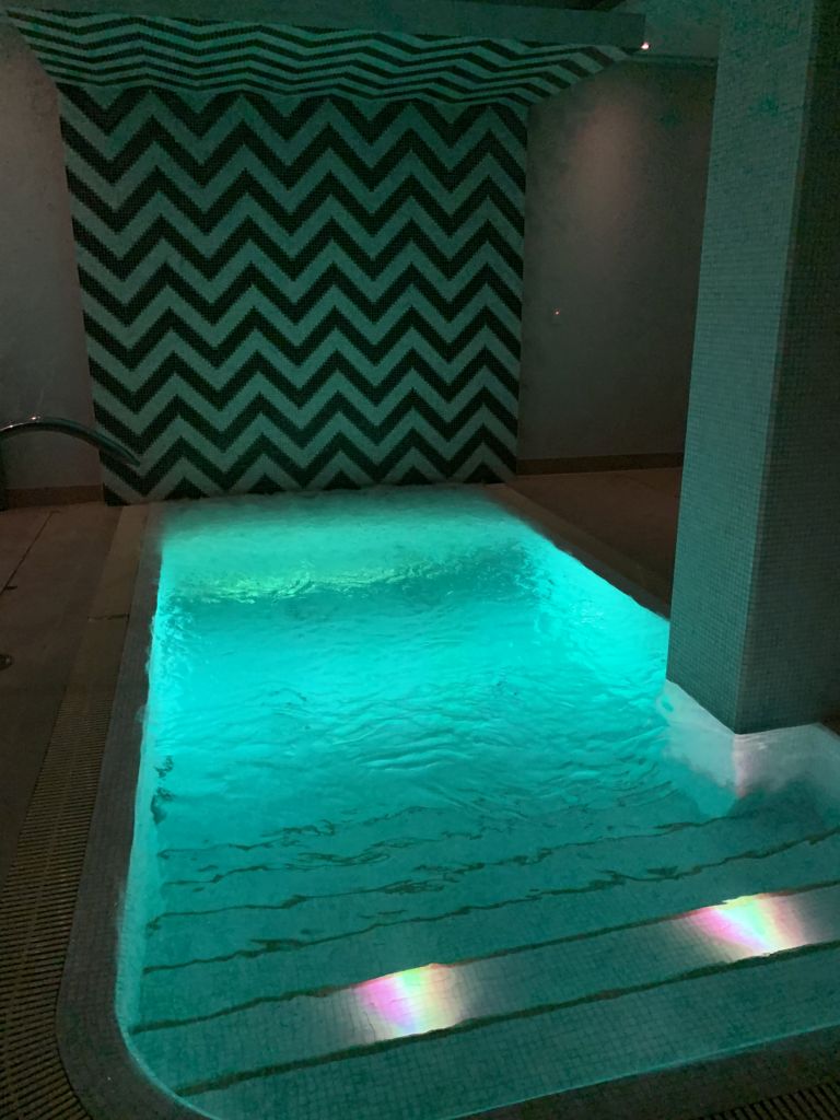 Die „Level-up Zone“ besteht aus zwei Räumen. In dem größeren Teil des Wellness-Bereichs findet sich ein Whirlpool, der in unterschiedlichen Farben beleuchtet wird. Außerdem fanden wir dort eine Sauna, das Dampfbad und einige Duschen inklusive Eis-Schale. Für Erfrischungen ist ebenfalls gesorgt, da direkt neben der Zugangstür ein Wasserspender sowie Obst bereit stehen.