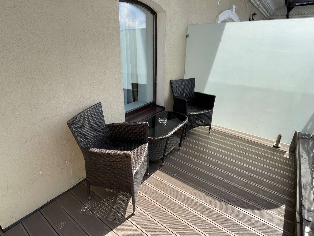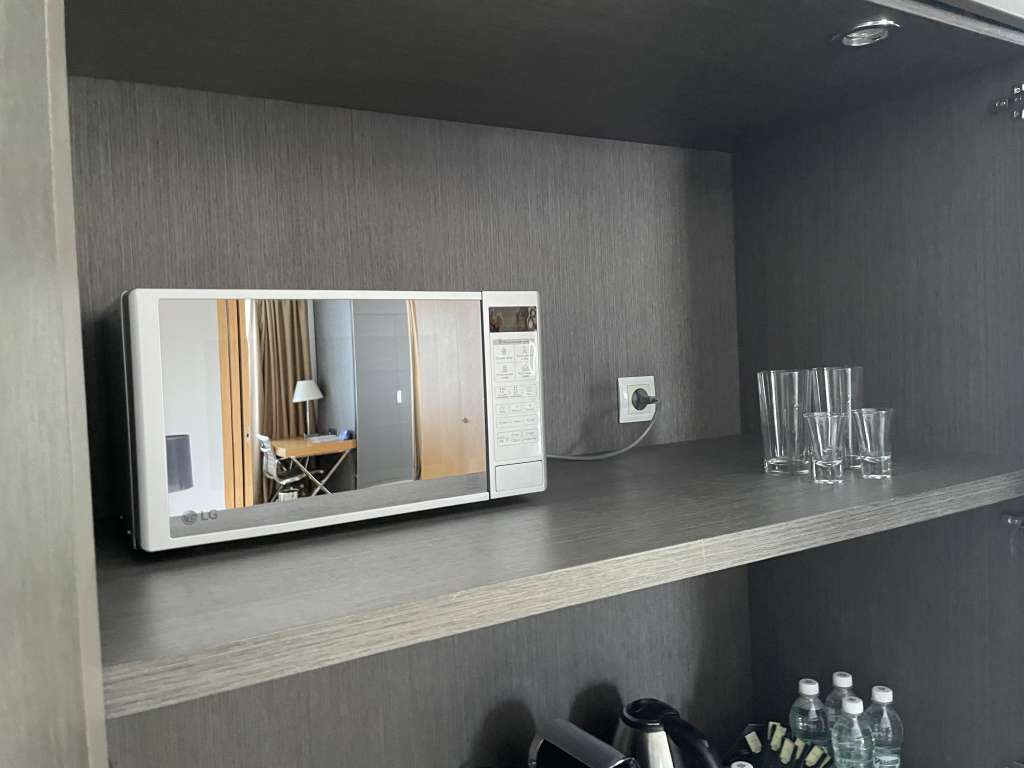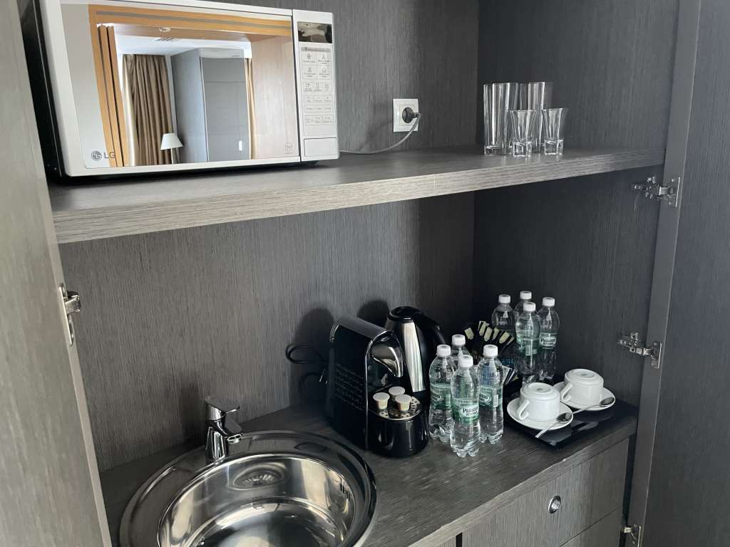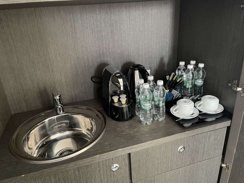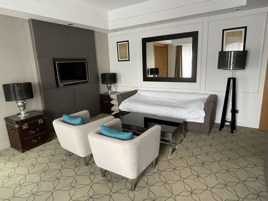 Nachdem ich mit der Schlüsselkarte die Zimmertür öffnete, konnten wir den großzügigen Wohnraum betreten. Dort begrüßte uns zunächst eine bequeme Couchgruppe mit Tisch und einem Fernseher. Weiterhin befanden sich in diesem Teil des Raumes ein Schmink- oder Schreibtisch, der Zugang zum Gäste-WC und zum Balkon. In einem Einbauschrank befand sich eine kleine Küchenzeile mit Spülbecken, Minibar, Wasserkocher und einer Kaffeemaschine. Auch das kostenlose Wasser stand hier bereits bereit.