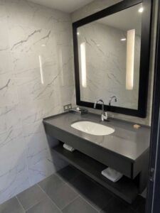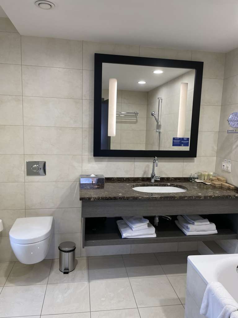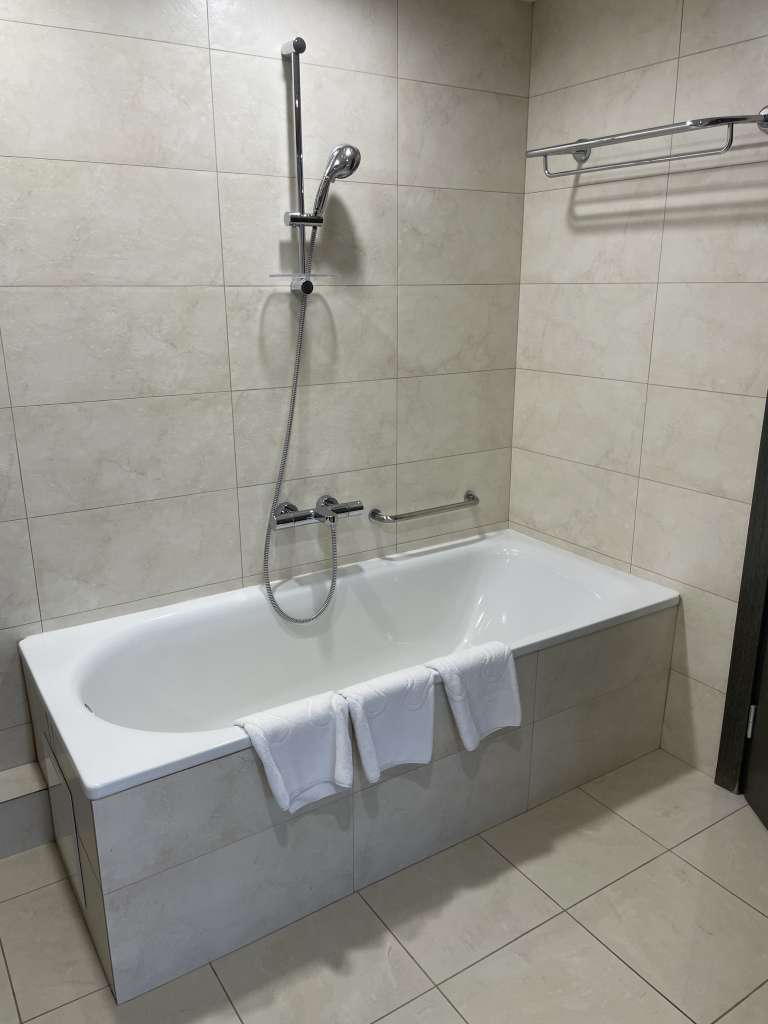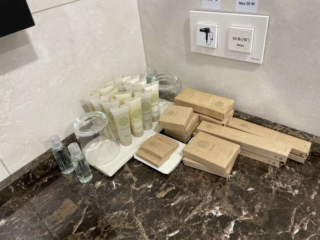 Genauso großzügig wie der Rest der Suite ist das Badezimmer dimensioniert. Dusche und Badewanne sind voneinander getrennt. Und auf dem Waschtisch standen jede Menge Amenities bereit. Die Pflegeprodukte sind von der Marke Greenery und werden (Gott sei Dank) weiterhin in kleinen Plastikflaschen präsentiert.