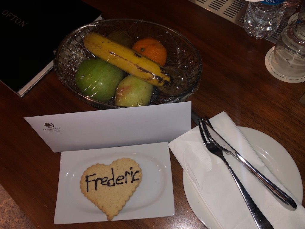 Auf dem Schreibtisch im „Wohnzimmer“ stand zudem ein Fruchtteller mitsamt beschrifteten Keks bereit – eine nette Willkommensgeste!