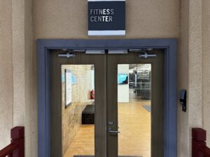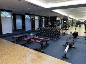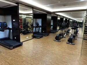 In der oberen Etage ist ein Außenpool und das Fitnessstudio sowie ein Spa mit Sauna.