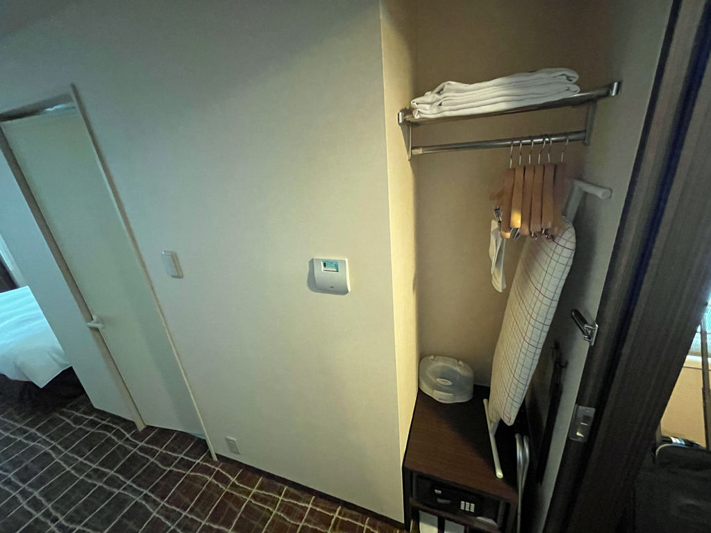 Kommt man ins Zimmer steht man in einem schmalen Durchgang. Dort befinden sich eine Kleiderstange und ein Regal. Auf dem Regal liegt sogar ein Schlafanzug bereit. Außerdem gibt es in dieser Nische ein Bügeleisen mit Bügelbrett sowie einen kleinen Safe.