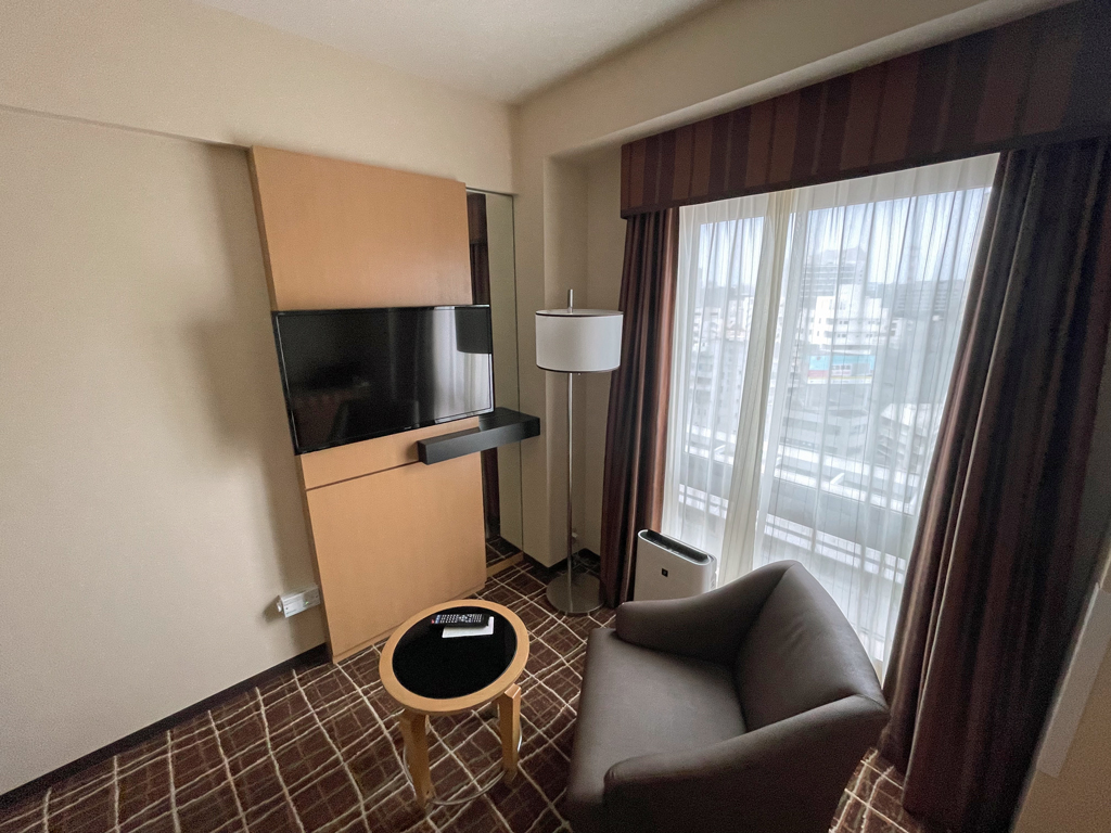 Durch den schmalen Eingangsbereich (und an der Badezimmertür vorbei), erreicht man den Hauptraum des Zimmers. Dort stand wie reserviert ein King Size Bett, an dessen Seiten sich kleine Nachttische befinden. Vom Bett guckt man – etwas ungewöhnlich – auf eine nackte Wand. Der Fernseher hängt vom Bett versetzt neben der Wand. Den besten Blick darauf hat man von einem Sessel, der mit einem Tischchen etwas verloren vor dem Fenster mit Blickrichtung Fernseher steht.