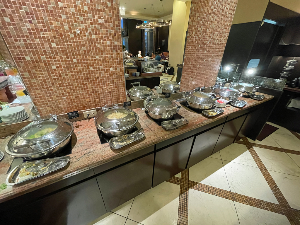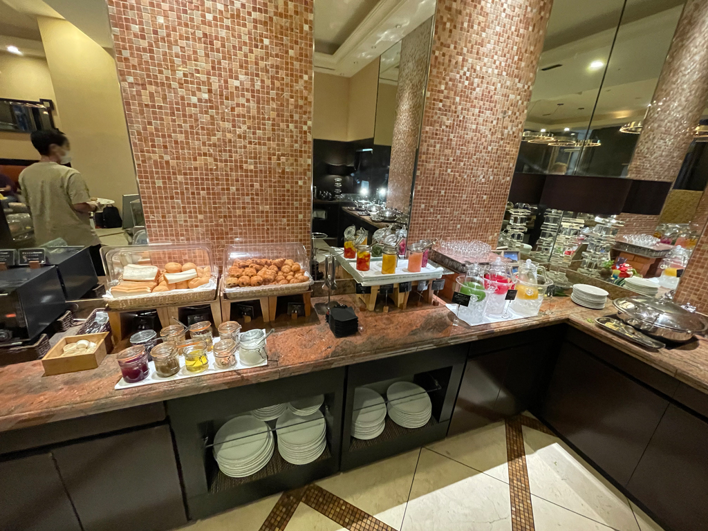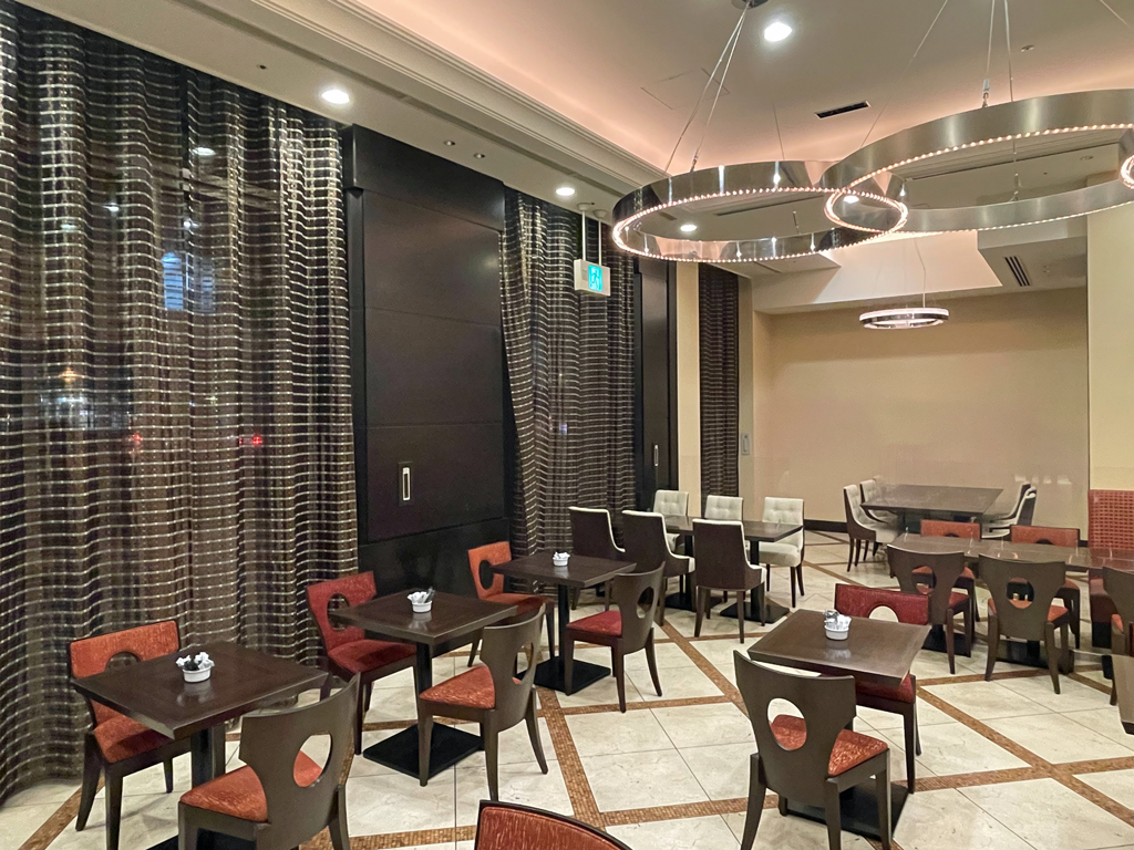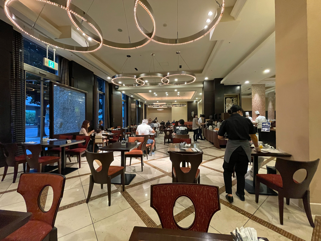 Das Frühstück wird im Hotelrestaurant im Erdgeschoss in Buffetform serviert. Da das Hotel ausgebucht war, wurde ich gebeten, einen Slot zu reservieren. Beim Einlass nennt man seine Zimmernummer und wird zu einem Tisch gebracht. Ja nach vermuteter Attraktivität der Tische, sind diese zunächst für Diamond und Gold Member reserviert. Während des Frühstücks steht dann ein violetter bzw. orangefarbener Würfel auf dem Tisch, damit bloß jeder sieht, welchen Status die Menschen am Tisch haben.