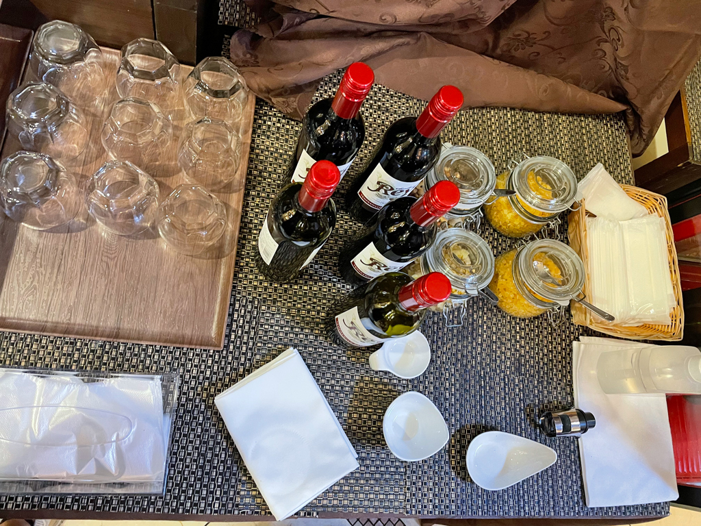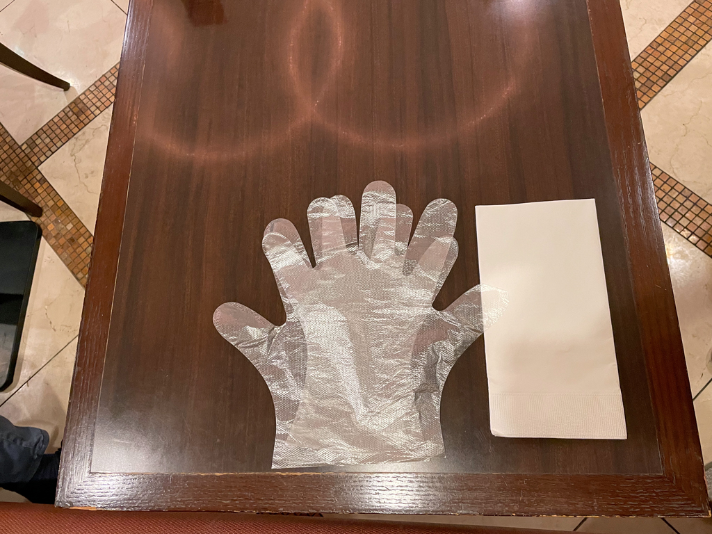 Auf den Tischen lagen überall Plastikhandschuhe bereit, die man tragen musste, wenn man sich etwas vom Buffet nehmen wollte.