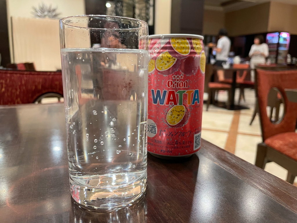 Im Restaurant ist dann ein Kühlschrank offen, aus dem man maximal zwei Getränke pro Person entnehmen darf. Zur Auswahl stehen: Orion Bier, Coca Cola, Orangensaft, zwei Limonaden mit Alkohol, Rotwein, Weißwein und kalter Tee, Fanta (lokale Geschmacksrichtung) sowie Sekt. Zum Kauen gibt es einen Nussmix, getrocknete Bananen oder kandierte Früchte. Die ganze „Party“ läuft nach dem Selbstbedienungskonzept ab, d.h. man holt sich die Sachen aus dem Kühlschrank und räumt hinterher seinen Tisch wieder auf. Staff sieht man keinen während der Reception. (Falsch: Ab und an tragen Mitarbeiter die vollen Rückgabetabletts weg, aber da muss man schon lange beim Empfang aushalten und ganz genau hinsehen.)