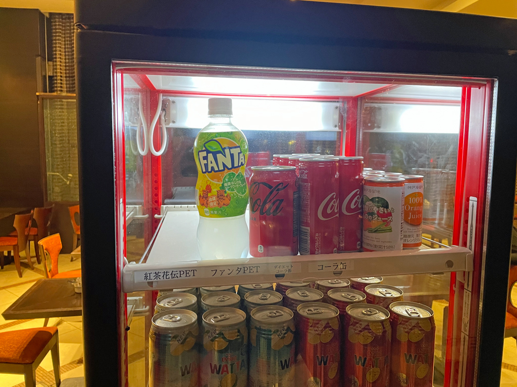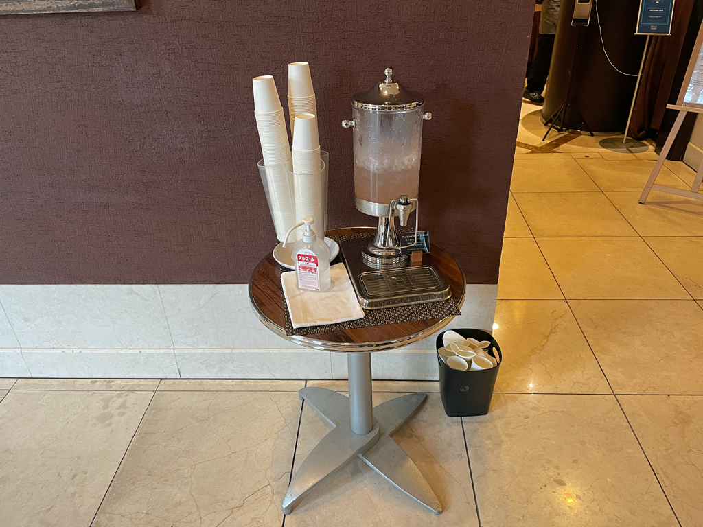 In der Lobby gibt es einen Getränkespender, an dem man sich jederzeit aromatisiertes Wasser gratis ziehen kann.