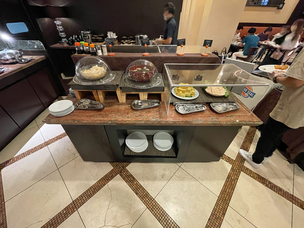 Das Frühstücksbuffet war umfangreich. Es gab warme Speisen nach westlichem Gusto (Rührei, Speck, gegrillte Tomaten), aber auch japanische Frühstücksgerichte (was für Europäer eher etwas zum Mittagessen wäre). Das waren Dinge wie Reis und dampfgegartes Gemüse. Zudem gab es auch eine Auswahl an Spezialitäten aus Okinawa (z.B. Salznudeln oder Eis aus besonderen Knollen). An kalten Optionen gab es Gebäck, Obst und Cerealien.