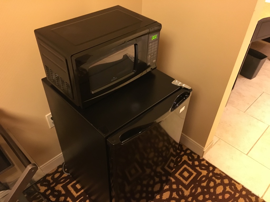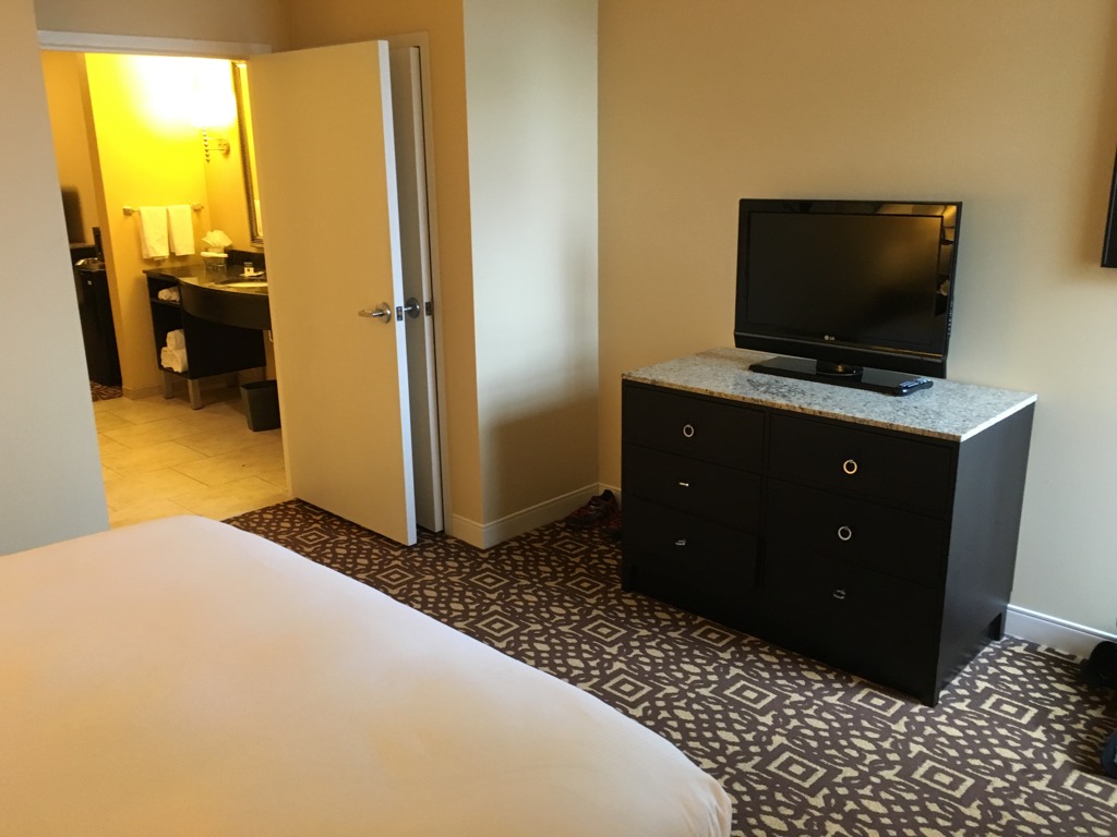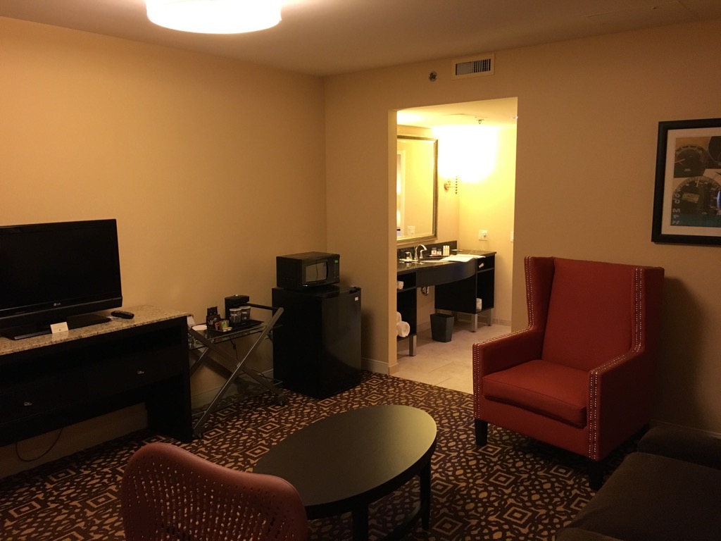 Das DoubleTree Detroit Downtown – Fort Shelby ist ein all Suite Hotel, demnach war auch mein „Standard Zimmer“ eine Suite. Direkt nach dem Eintreten in das Zimmer gelangt man in das innenliegende Wohnzimmer. Dieses ist zwar angenehm groß und neben Fernseher und Couch auch mit einem Schreibtisch, sowie einem Kühlschrank ausgestattet. Leider verfügt das Wohnzimmer über keine Fenster, was es sehr dunkel machte.