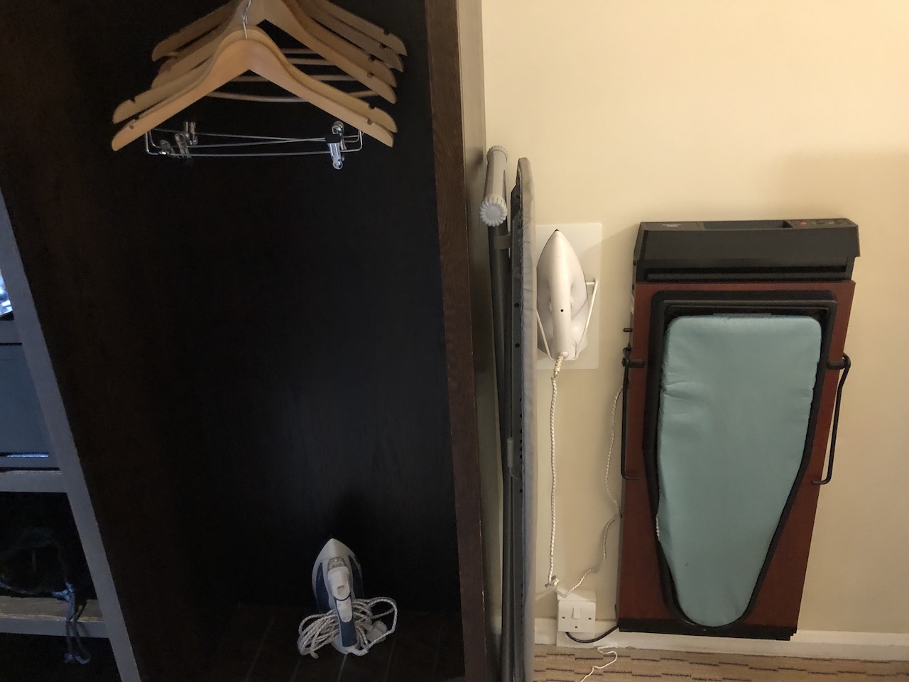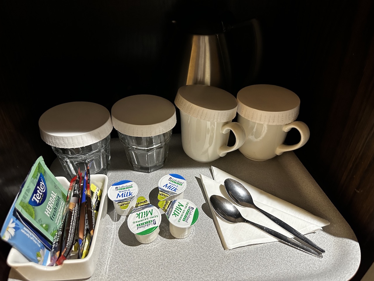 Wie fast überall gibt es auch im DoubleTree einen Wasserkocher samt Kaffee und Tee, Kühlschrank, Bügeleisen und Föhn.