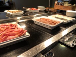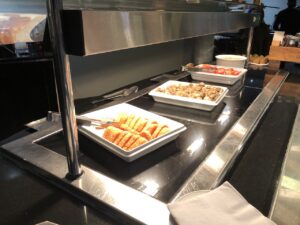 Gegenüber der Lobby ist die Bar, neben Getränken kann man auch warme und kalte Snacks bestellen.