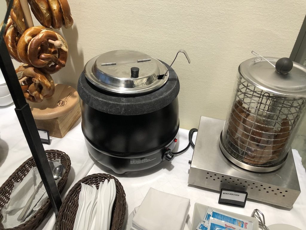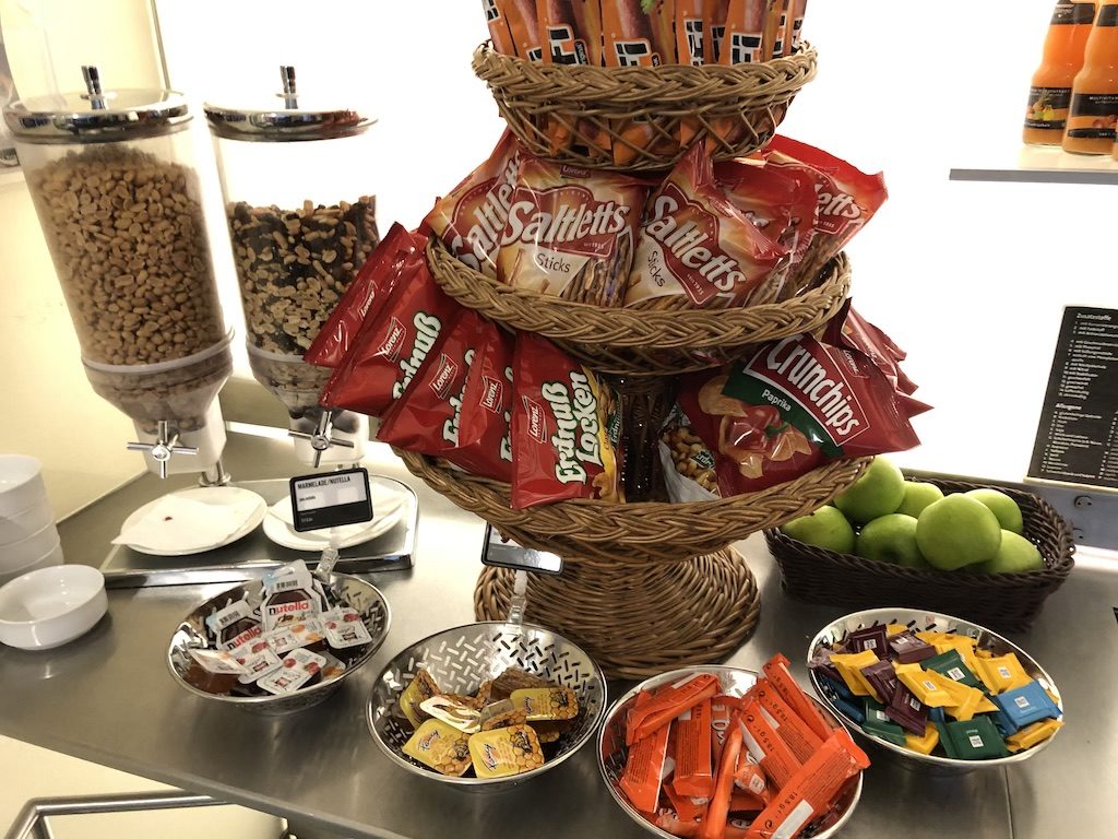 Auf den ersten Blick nichts wirklich Weltbewegendes in Sachen Catering. Ich habe die Lounge schon mehrfach besucht und leider auch abgegraste Platten und Körbe auf dem Buffet vorgefunden. Diesmal war es anders! Es gab Wiener Würstchen, eine heisse Suppe, frische Brezen, Brot und süßes Gebäck. Zahlreiche Snacks wie Chips, Schokolade, Obst, Nüsse und Kekse gibt es rund um die Uhr.