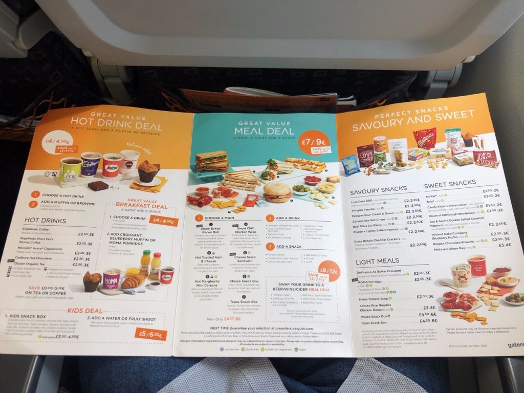 Eine kostenlose Verpflegung mit Getränken oder Snacks wird bei Easyjet grundsätzlich nicht angeboten. Jedoch offeriert man ein großzügiges Buy on Board-Angebot in einer ausliegenden Karte. Gäste können hier aus vielen kleinen Snacks und alkoholischen bzw. alkoholfreien Getränken auswählen und diese bei der Crew kaufen.