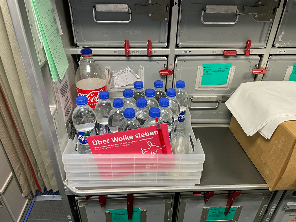 Noch vor dem Start wurden Kopfhörer und Wasserflaschen verteilt. Damit deckte diese Grundausstattung die wichtigsten Bedürfnisse ab.