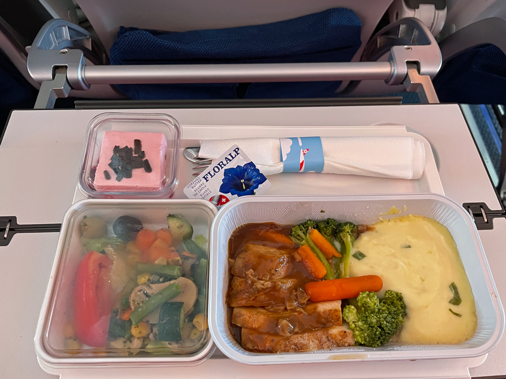 Sobald wir auf den Plätzen saßen wurden wir von einem der Flugbegleiter nach unserer Auswahl für das Mittagessen gefragt. Zur Auswahl standen „Chicken or Pasta“. Ich entschied mich für das Hühnchen. Das Essen wurde ca. eine Stunde nach dem Start vom Trolley verteilt. Geschmacklich war es in Ordnung, mengenmäßig für mich eher schmal.