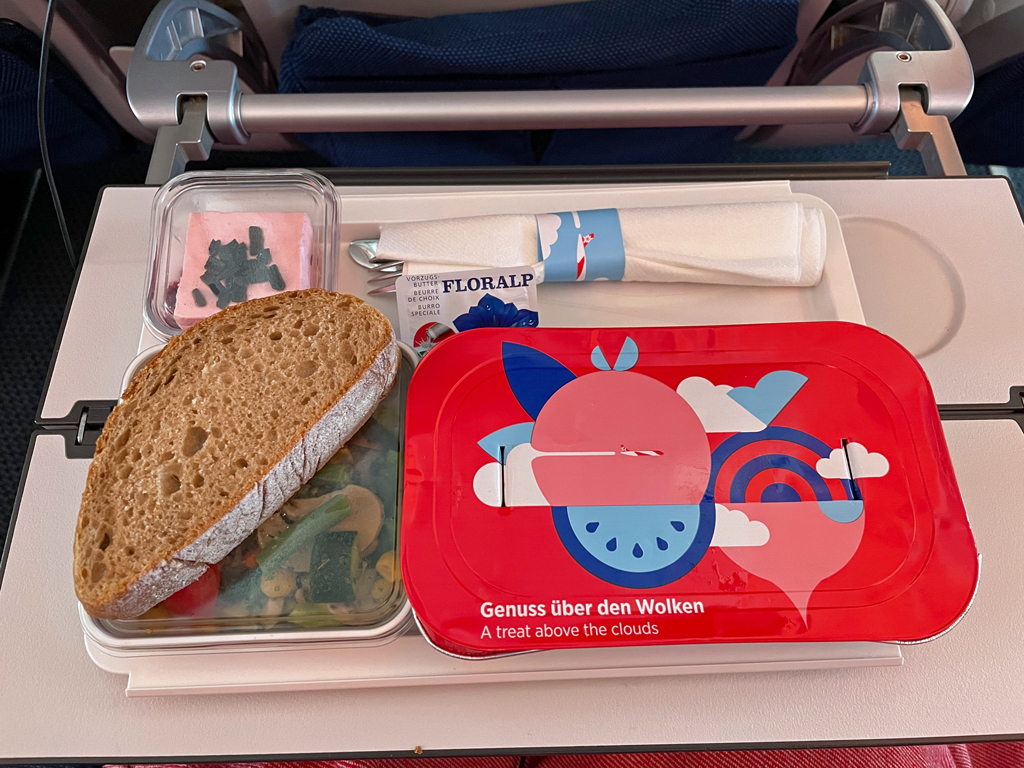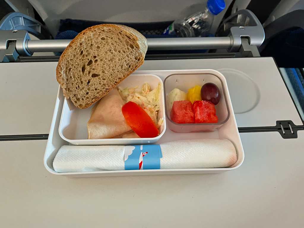 Das Catering besteht auf dem Flug grundsätzlich aus zwei Malzeiten. Einem Mittagessen kurz nach dem Start und einem umfangreicheren Snack kurz vor der Landung. Zwischendrin gibt es dann kleine Snacks von der Crew.
