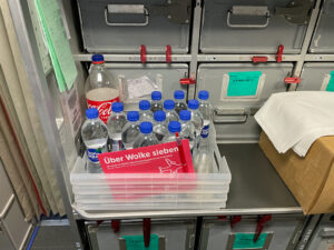 Da die Kabine nicht voll besetzt war, hatten die beiden Flugbegleiter in der Economy Comfort Max „leichtes Spiel“. Die Verteilung von Essen und Getränken verlief zügig und auch das Abräumen dauerte nicht lange. Für Getränkebestellungen bin ich meist nach vorne in die Galley gegangen. Dort wurde die Bestellung aufgenommen und das Getränk wurde dann wenig später an meinen Platz gebracht.