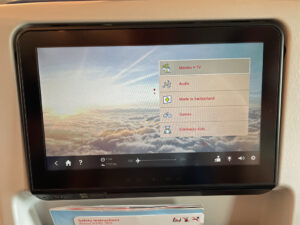 Damit niemand heimlich Filme mit aus dem Flugzeug nimmt, wird immer wieder „Swiss“ oder „LX“ eingeblendet. Außerdem fangen alle Filme mit Werbung an. Das finde ich gar nicht einmal so schön. Aber wenn es hilft, die Ticketpreise niedrig zu halten…