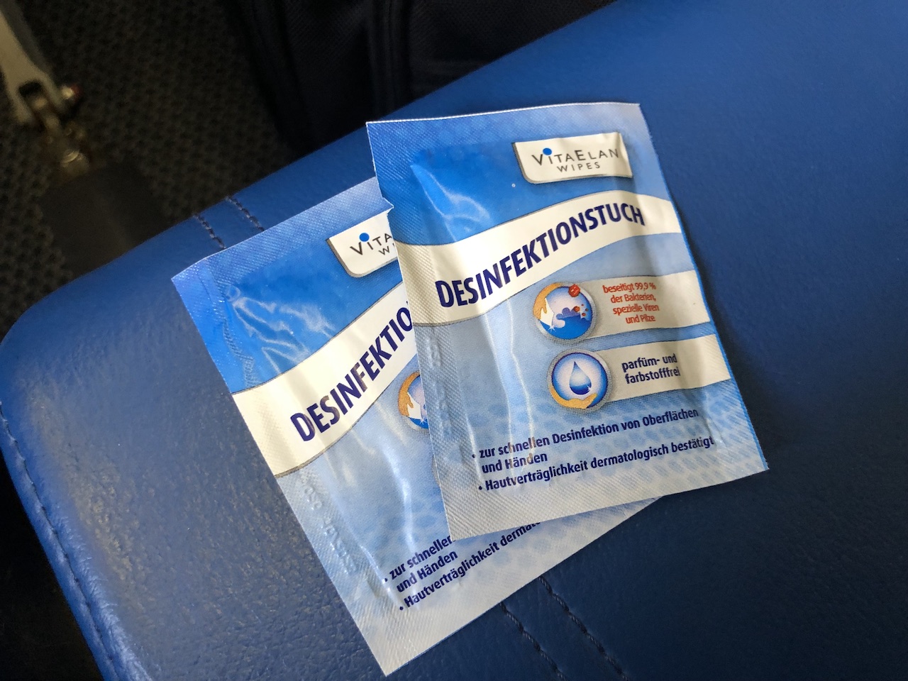 Freundlich wurden wir von den Flight Attendands empfangen, zur Begrüßung gab es Desinfektionstücher und eine Wasserflasche.