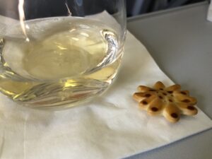 In der Business Class sind auch alkoholische Getränke inkludiert, zum Sortiment gehören auch vier verscheidene Weine und Champagner. Das Essen wurde gleichzeitig von der Maître de Cabine ausgeteilt, auf dem knapp 2-stündigen Flug wurde ein kaltes Tablett mit warmen Brötchen gereicht.