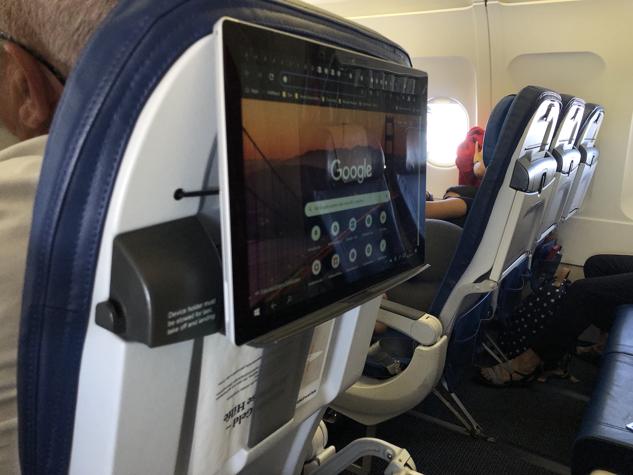 An Bord gibt es leider keine Steckdosen oder USB-Anschlüsse, allerdings hat man an Passagiere die ihre eigenen Devices nutzen möchten gedacht. Zum einen gibt es entsprechende Halterungen am Vordersitz: