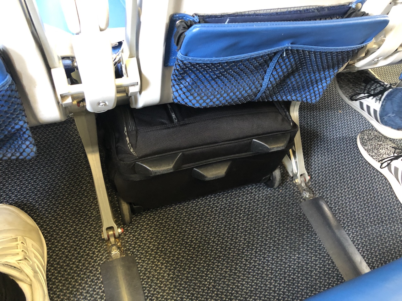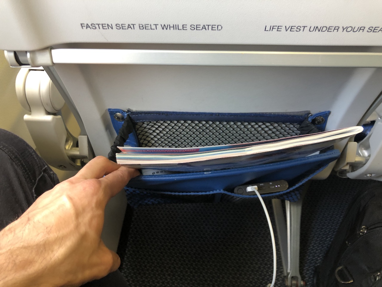 Bei Edelweiss gibt es noch richtig großzügige Sitztaschen für Bücher und sonstigen Schnickschnack, für das Handgepäck habe ich einfach den Stauraum unter dem geblockten Mittelplatz genutzt.
