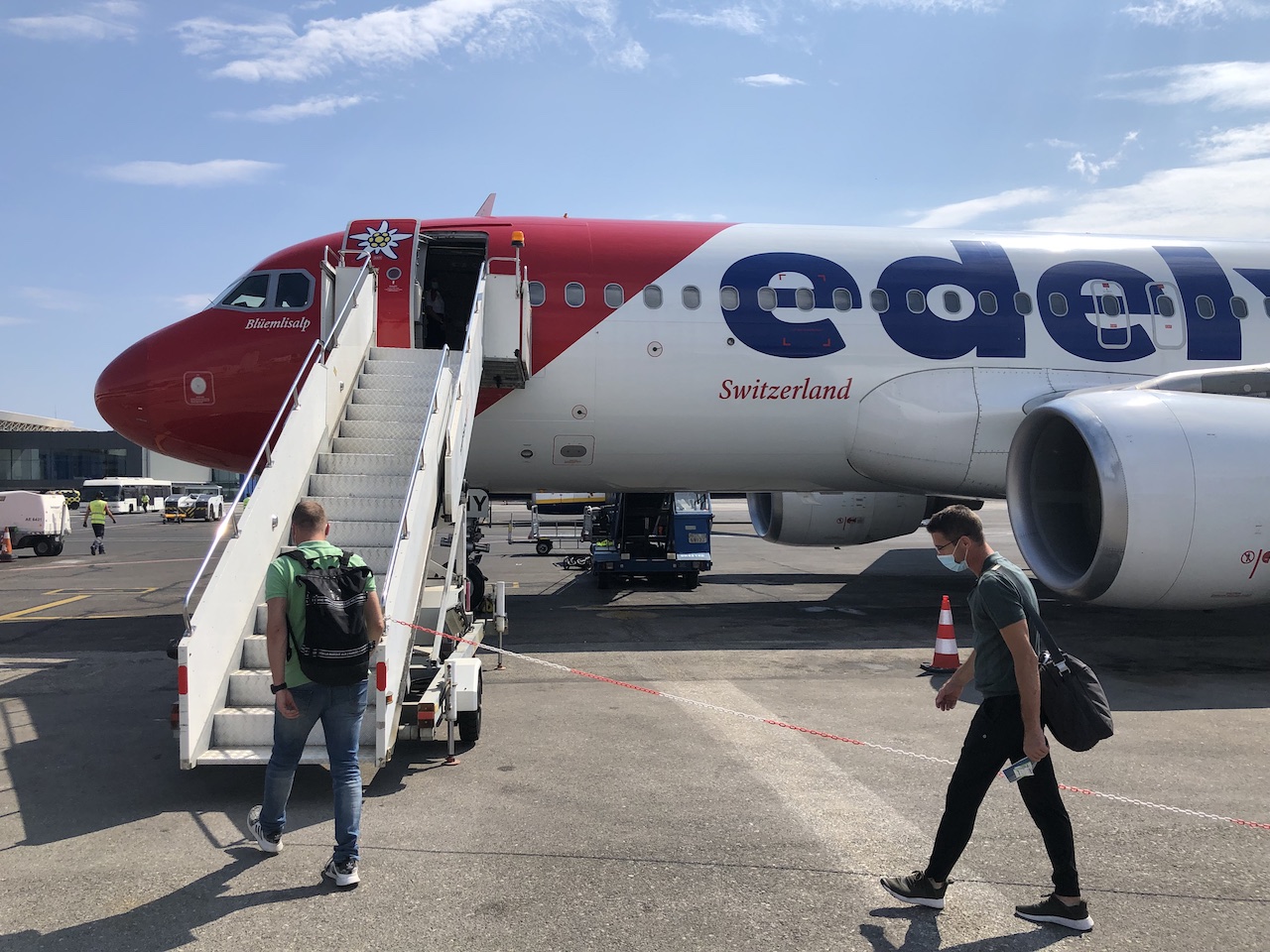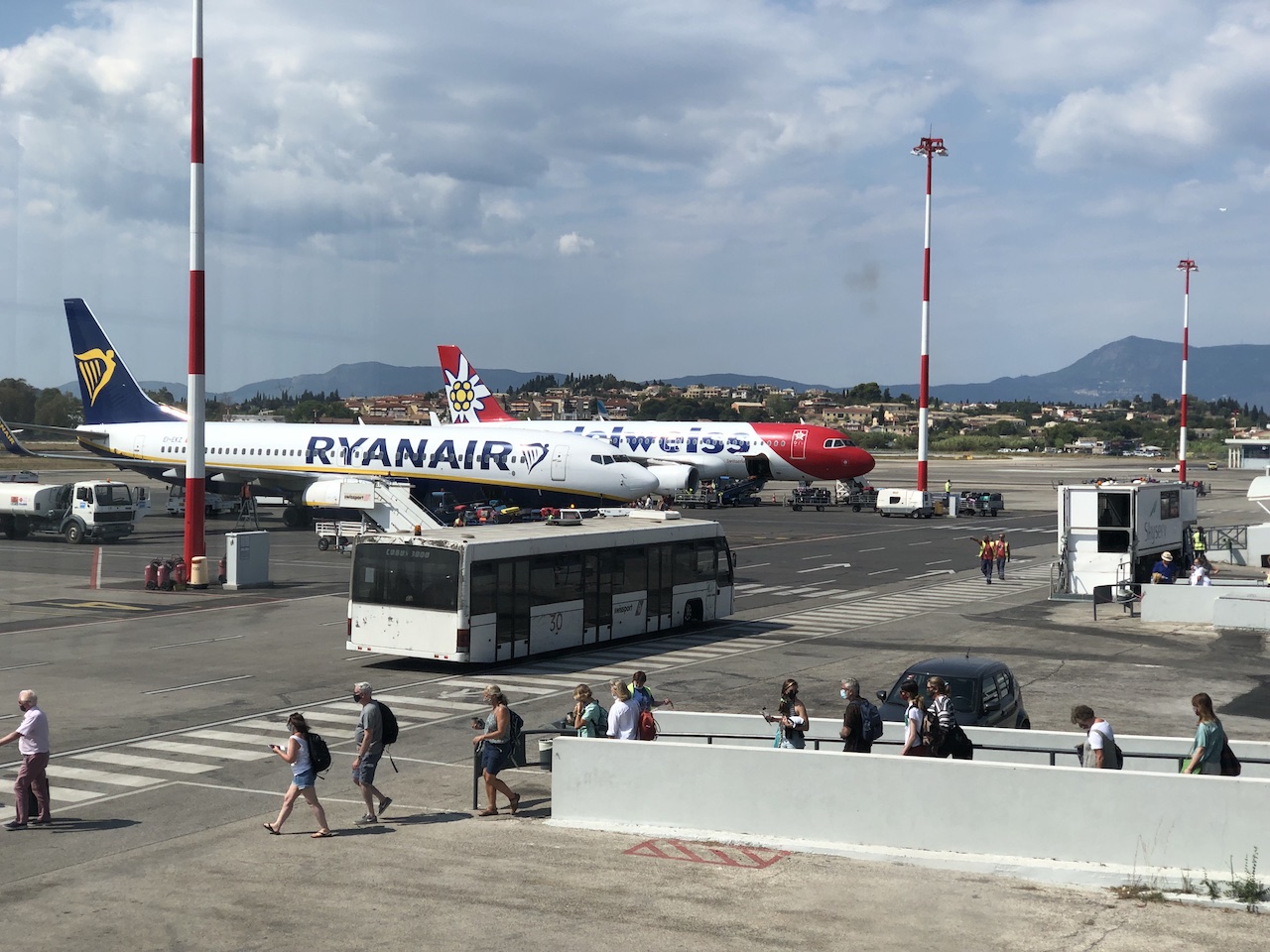 Auf dem kleinen Inselairport war heute wieder viel los, die meisten Airlines kommen aus dem Vereinigten Königreich. Das Boarding für unseren Flug nach Zürich startete pünktlich und begann mit Passagieren der Business Class. Am Flughafen CFU gibt es keine Fluggastbrücken, zum Einsteigen gelangt man zu Fuss oder mit dem Bus.