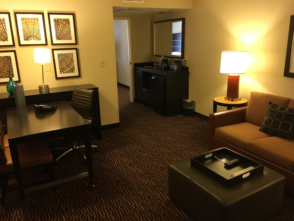 Alle Embassy Suites Hotels sind in ihrem Aufbau sehr ähnlich. Die Zimmer befinden sich um ein riesiges Atrium. Meine Suite im Embassy Suites LAX Airport befand sich auf der achten Etage und bestand aus einem Wohnzimmer und einem Schlafzimmer im hinteren Bereich. Durch die Lage zum Atrium hin sind die Wohnzimmer leider recht dunkel und haben kein Tageslichtfenster.