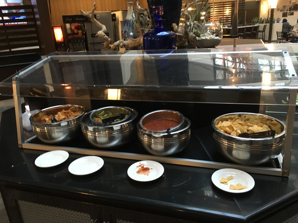 Wie ich oben schon erwähnt habe, erhalten alle Gäste des Embassy Suites kostenloses Frühstück, sowie einen „evening reception“ mit alkoholischen Getränken. Beides wird in der Lobby angeboten. Aufgrund der hohen Anzahl der Zimmer ist der Essensbereich auch entsprechend groß.