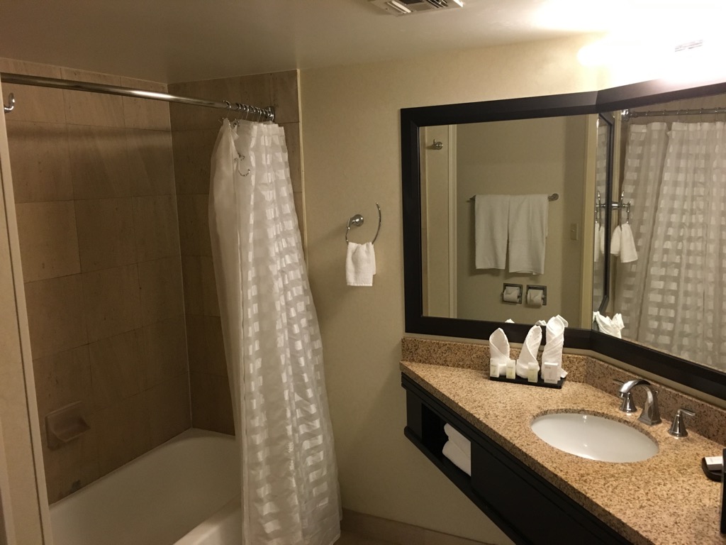 Das Badezimmer selbst ist recht einfach. Neben einer Toilette und dem Waschbecken befindet sich hier die in den USA leider übliche Badewanne mit Duschvorhang. Amenitys befanden sich natürlich auch im Badezimmer.