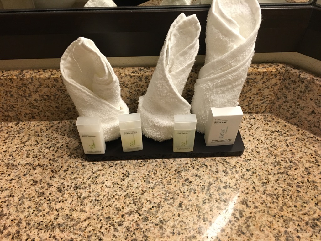 Der Check-In war, wie man es von Hilton gewohnt ist, schnell und effizient. Nachdem meine Daten abgeglichen wurden, wurde mir mit dem üblichen „Thank you for your loyalty“ eine Tüte mit zwei Wassern und einem Snack überreicht.