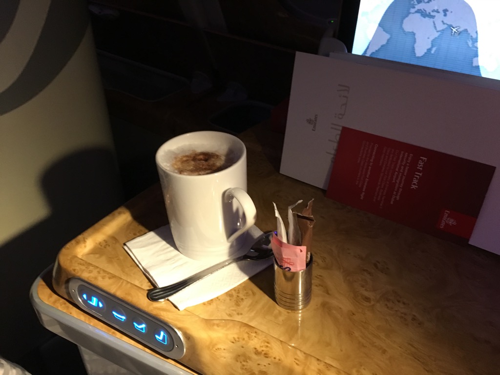 Nach dem Frühstück hatten wir noch etwa 1.30 Stunden bis Dubai und die Crew begann hier bereits mit den Vorbereitungen für die Landung. Ein weiterer Espresso vor der Landung wurde mir allerdings noch gebracht, wobei ich hierauf fast 10 Minuten warten musste.